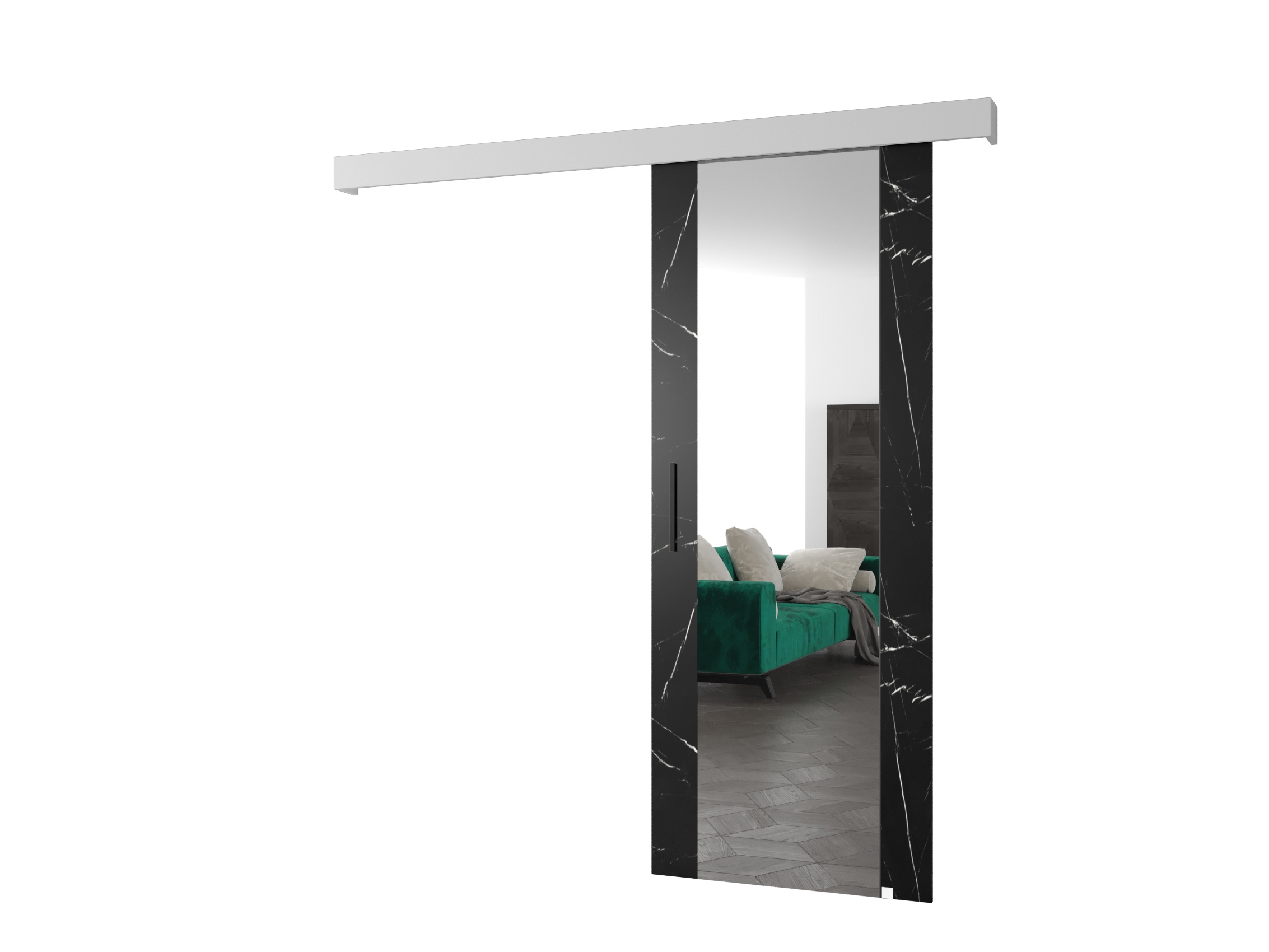 Posuvné dvere 90 cm Sharlene II (mramor čierny + biela matná + čierna) (so zrkadlom)