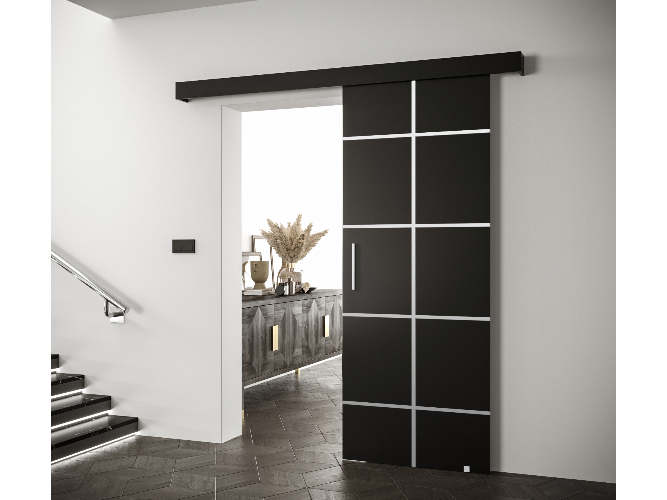 Posuvné dvere 90 cm Sharlene III (čierna matná + čierna matná + strieborná)