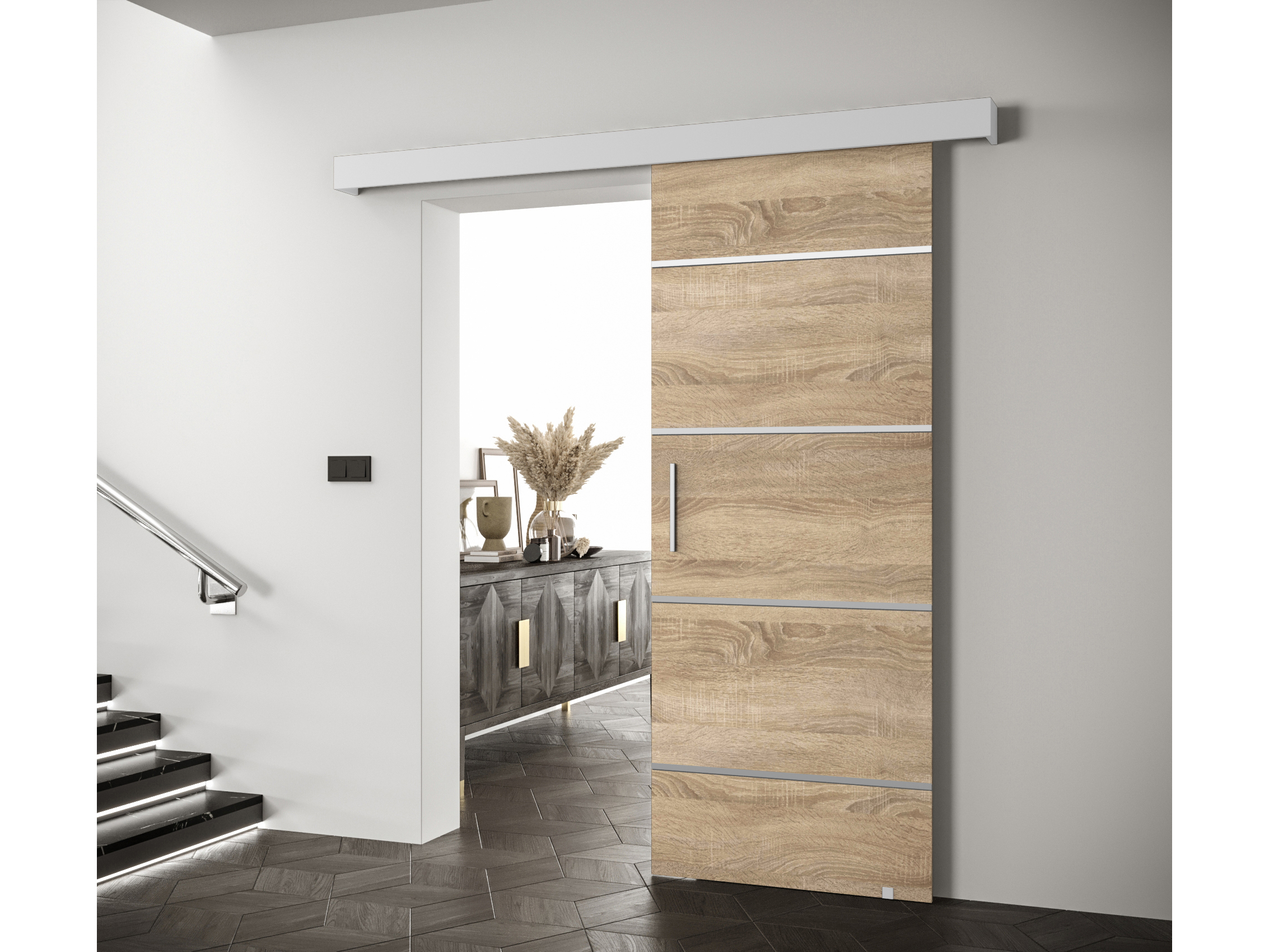 Posuvné dvere 90 cm Sharlene IV (dub sonoma + biela matná + strieborná)