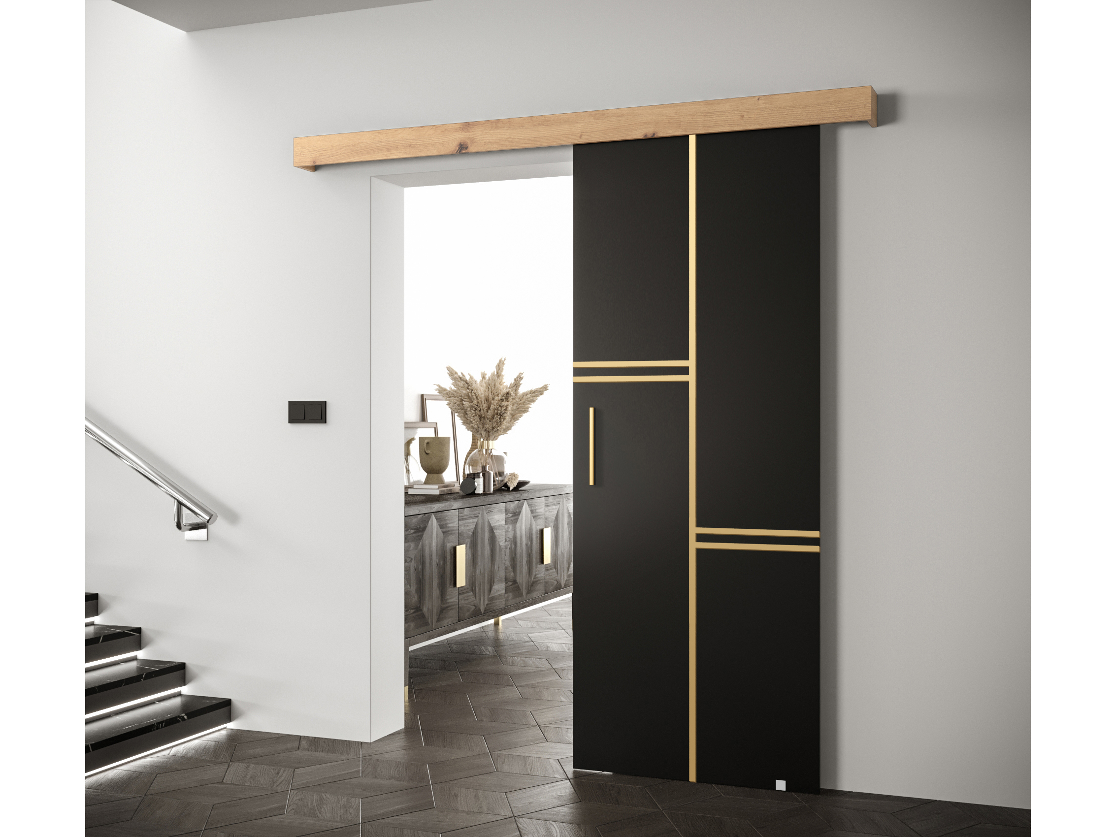 Čierna matná + dub artisan + zlatá