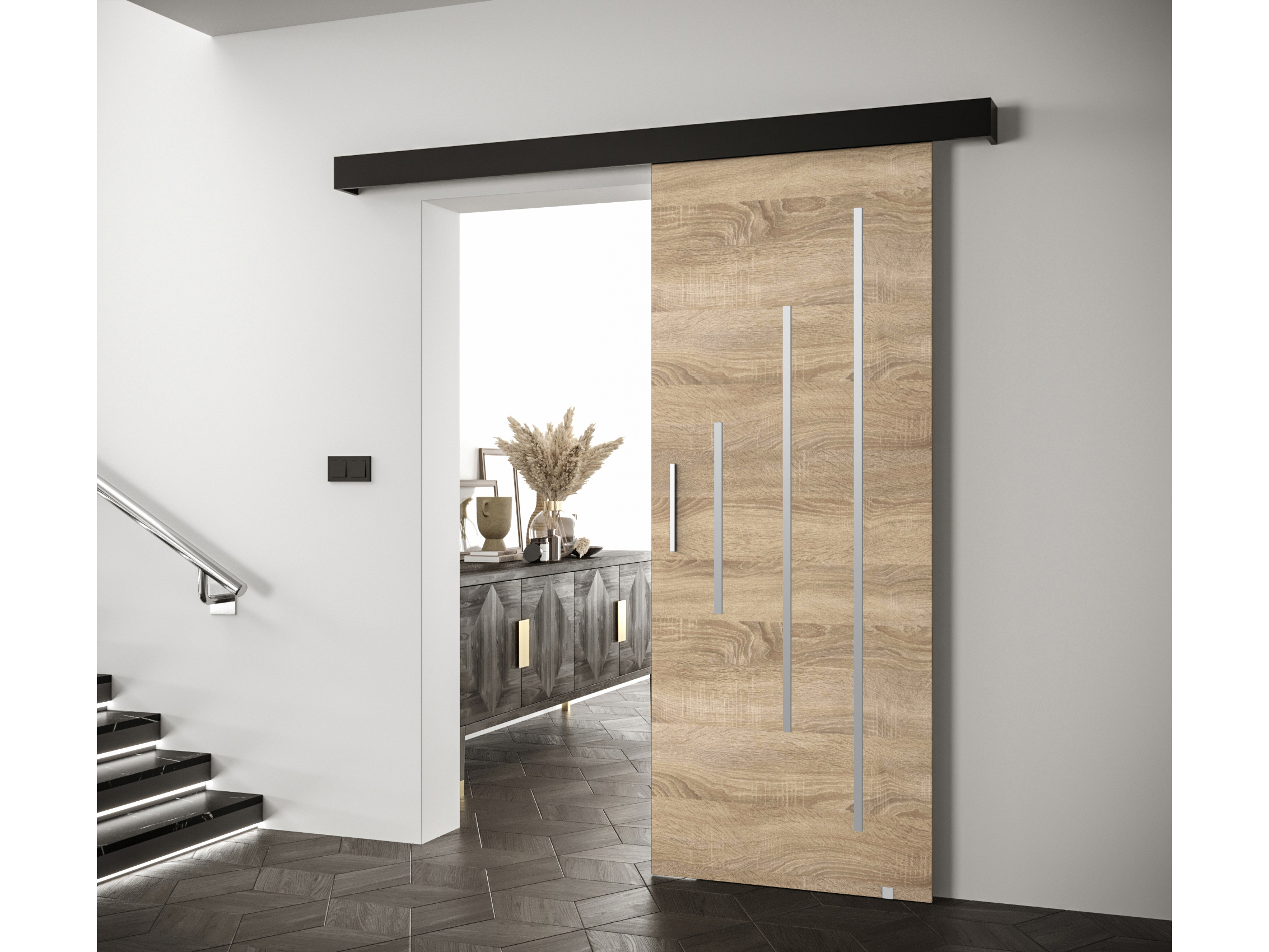 Posuvné dvere 90 cm Sharlene Y (dub sonoma + čierna matná + strieborná)