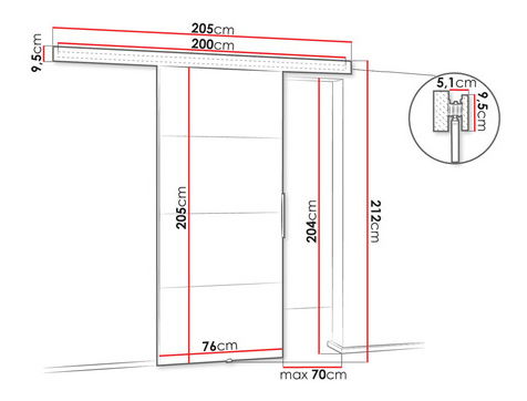 krídlo dverí sa posúva na koľajničke namontovanej nad otvorom dverí pod fasádou,