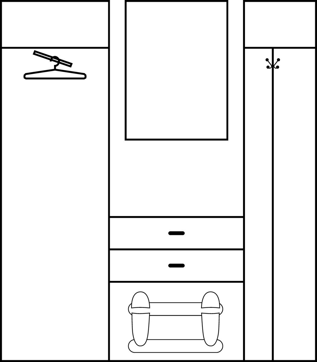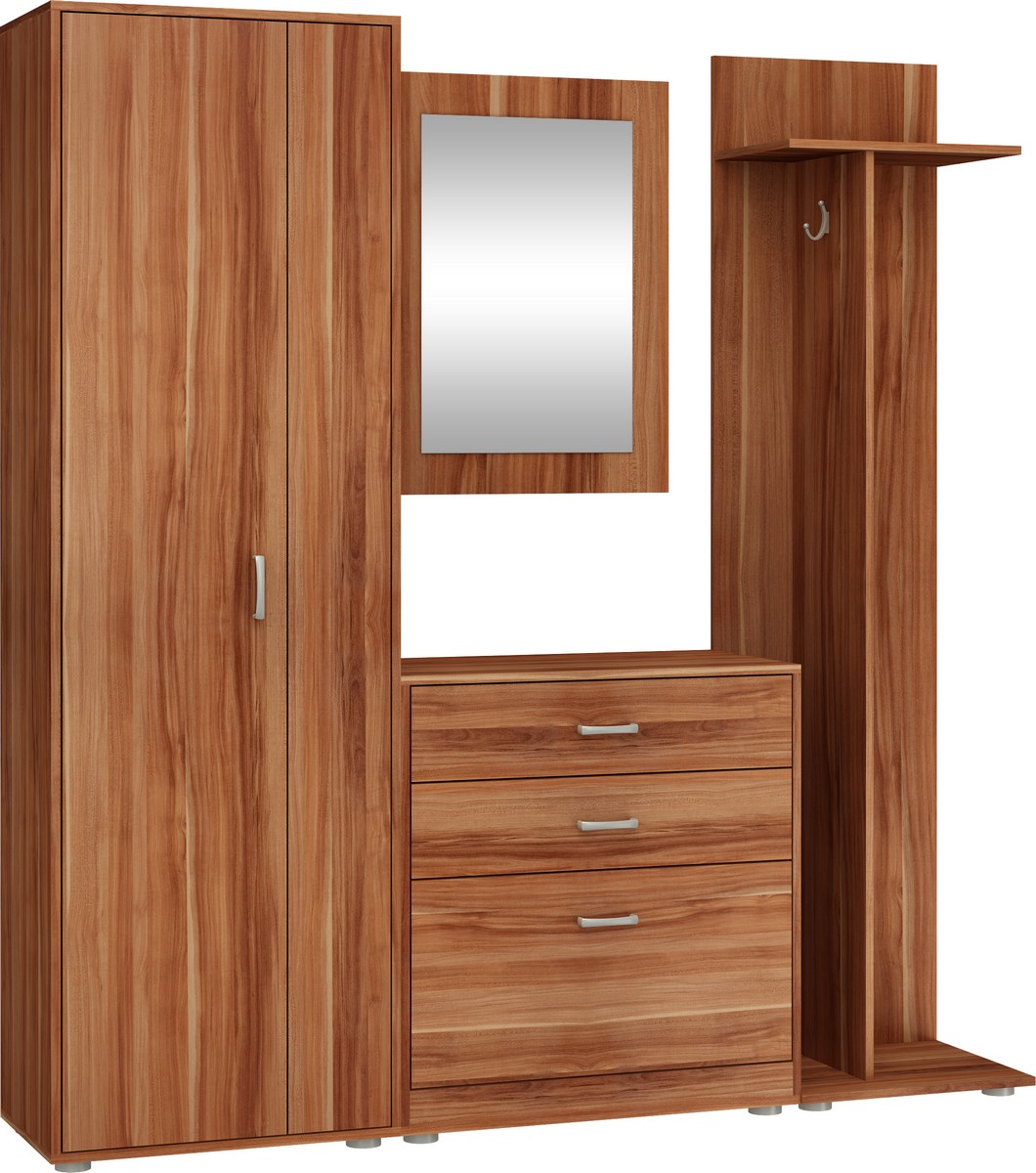 Štýlová, moderná a zaujímavo farebne zladená predsieň, ktorá zaujme svojím usporiadaním úložného priestoru. Na ľavej strane sa nachádza jednodverová šatníková skriňa, na pravo od nej je na spodku botník s 2 zásuvkami so zrkadlom (vešia sa na stenu). Na pravo je zvislá dlhá doska zabudovaná v hornom s dolnom obdĺžniku (ktoré slúžia ako poličky) a za ňou sa nachádza zadná plná platňa, na ktorej sú upevnené 2 háčiky. Farebné prevedenie je slivka.