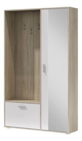 Predsieň Bliss (dub sonoma + biela) je moderná predsieňová zostava s výškou 195,5 cm, šírkou 120 cm a hĺbkou 33 cm. Zostava obsahuje zrkadlo a praktickú skriňu s vešiakmi a police na topánky. Na vonkajšej strane sa nachádzajú tri vešiaky na bundy, kabáty, blúzky alebo kabelky, ktoré sú ľahko prístupné. Skrinka na topánky pod vešiakom poskytuje jednoduchú organizáciu. Šatníková skriňa na ľavej strane obsahuje dve police, jednu hornú a jednu spodnú, ktoré sú vhodné na uloženie vecí potrebných na rovný povrch. Zostava má tiež výsuvnú vešiakovú tyč, ktorá zvyšuje jedinečnosť a funkčnosť celej zostavy. Predsieň Bliss je dostupná v prírodných drevených dekóroch a je vynikajúcou voľbou pre tých, ktorí hľadajú modernú, funkčnú a elegantnú zostavu pre svoju predsieň.