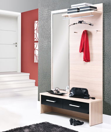 Jednoduchá no moderná predsieň, ktorá sa svojimi rozmermi hodí najmä do menších priestorov. Je vyrobená z laminovanej DTD v nádhernej farbe dreva rijeka svetlá, ktorá je doplnená o čierne zásuvky. Na zadnom panely je umiestnená odkladacia polička, vešiaky na zavesenie oblečenia, zrkadlo, pod ktorým sú dve praktické zásuvky. Hrany sú ukončené ABS úpravou, ktorá zvyšuje odolnosť voči mechanickému poškodeniu, udržuje farebnú stálosť a odolnosť proti vlhkosti.