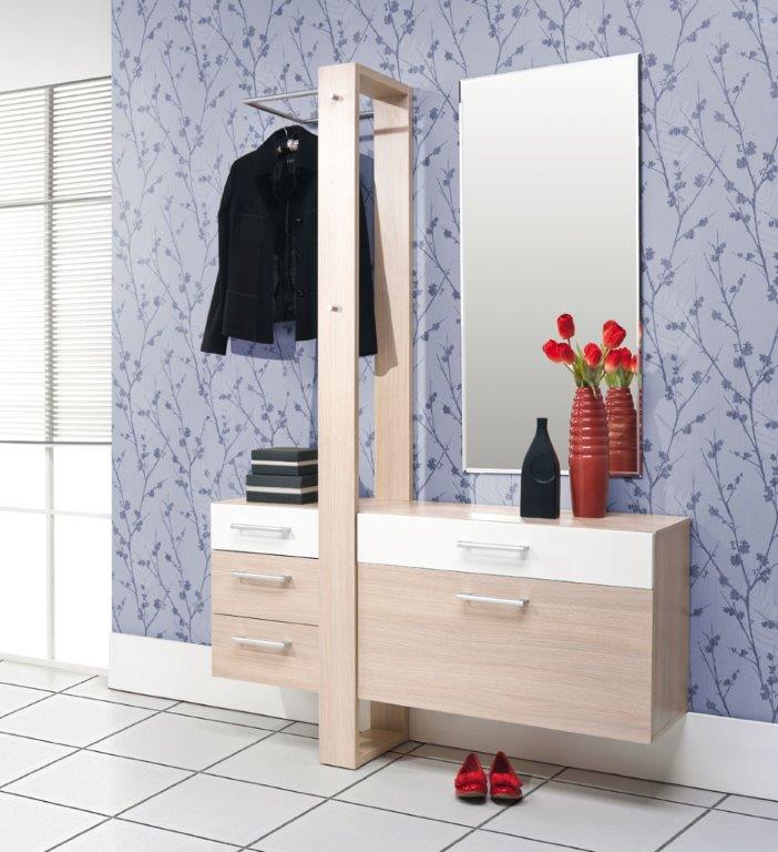 Jednoduchá no moderná predsieň, ktorá sa svojimi rozmermi hodí najmä do menších priestorov. Je vyrobená z laminovanej DTD v nádhernej farbe dreva rijeka svetlá, ktorá je doplnená o biele zásuvky. Na nosnej konštrukcii sú umiestnené vešiaky a zásuvky s botníkom. Hrany sú ukončené ABS úpravou, ktorá zvyšuje odolnosť voči mechanickému poškodeniu, udržuje farebnú stálosť a odolnosť proti vlhkosti.