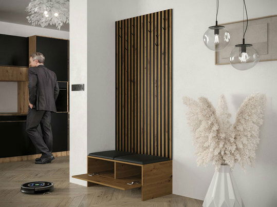 ZobraziťElara IV sa postará o štýlový dizajn predsiene. Kombinácia skrinky na topánky so sedadlom a panelu s vešiakmi zvyšuje funkčnosť celej miestnosti. Upravuje vstup do bytu a podporuje harmóniu a módny vzhľad. Panel zdobený lamelami poskytuje priestor na zavesenie kabátov a búnd. Háčiky, ktoré sú k nemu pripevnené, ladia so štýlom vďaka svojej tmavej farbe. Nenápadne organizujú skladovanie vrchného oblečenia.