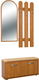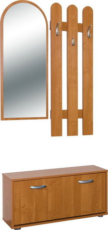 Predsieň zložená z 3 dielov. Skladá sa z vešiakového panelu (s tromi háčikmi), nízkej skrinky alebo botníka vybavenej poličkami na topánky a zrkadla. Sivé oválne úchyty, prevedenie jelša a buk.