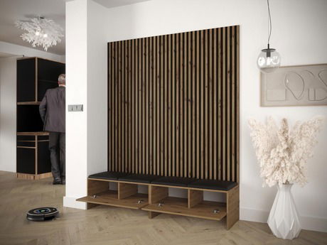 ZobraziťPredsieň Esmaldos V so sedákom Vám poskytne pohodlie už pri dverách Vášho bytu! Je vybavená prvkami, ktoré uľahčujú každodenné používanie vrchného oblečenia. Dve skrinky na topánky a početné vešiaky dopĺňajú ozdobné lišty. Dizajn predsiene doplní bytové usporiadanie, a dodá mu moderný nádych. Mäkké sedadlo z čalúnených panelov je dostupné v mnohých módnych farbách, ktoré dokonale zladíte s charakterom a dekorom vašej predsiene.