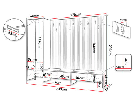 Predsieň so šatníkovou skriňou Esmaldos VI usporiada vrchné oblečenie a obuv celej vašej rodiny! Ide o zostavu premyslenú z hľadiska každodennej funkčnosti. Ponúka 12 dvojitých háčikov, na ktoré si pohodlne zavesíte bundu, kabát alebo čiapku. Keď si budete chcieť obuť alebo vyzuť topánky, budete ťažiť z pohodlia čalúneného sedadla. Prebytočné oblečenie a doplnky môžete uložiť do šatníkovej skrine. Svoje miesto tu nájdu aj rukavice, šatky a iné predmety. Štýl predsiene so sedákom skvele zapadne do moderných aj podkrovných priestorov.