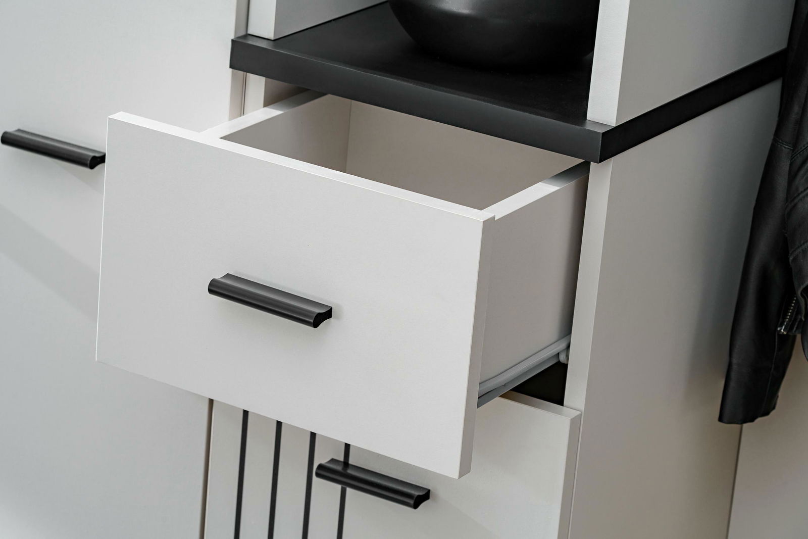 Vytvorte si dobre organizovaný a štýlový vstupný priestor s predsieňou Hagon v modernom prevedení kašmír s čiernymi detailami, moderný vzhľad podčiarkuje dekoratívna potlač pásikov, ktorá spája funkčnosť s vizuálnou eleganciou. Objavte predsieňové skrinky, ktoré ponúkajú viac než len prvý dojem. Vďaka premyslenému vnútornému členeniu získate bohatý odkladací priestor na topánky, doplnky, tašky či sezónne oblečenie. Zásuvky, otvorené police a skrinky s dvierkami vám umožnia udržiavať poriadok a mať všetko po ruke, no zároveň elegantne skryté pred zrakom návštev. Ideálne riešenie pre tých, ktorí chcú, aby ich predsieň pôsobila upravene a štýlovo. Vešiakový panel s hornou poličkou, pod ktorou sa nachádza vešiak – ideálny na odkladanie kabátov a búnd. Na stene nájdete navyše aj 2 samostatné vešiaky, ktoré poskytujú praktický priestor na každodenné použitie. Zostavu efektívne dopĺňa panel so zrkadlom a hornou poličkou. Poznámka: predsieň neobsahuje podsedák.