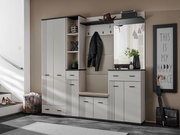 Vytvorte si dobre organizovaný a štýlový vstupný priestor s predsieňou Hagon v modernom prevedení kašmír s čiernymi detailami, moderný vzhľad podčiarkuje dekoratívna potlač pásikov, ktorá spája funkčnosť s vizuálnou eleganciou. Objavte predsieňové skrinky, ktoré ponúkajú viac než len prvý dojem. Vďaka premyslenému vnútornému členeniu získate bohatý odkladací priestor na topánky, doplnky, tašky či sezónne oblečenie. Otvorené police, zásuvky a skrinky s dvierkami vám umožnia udržiavať poriadok a mať všetko po ruke, no zároveň elegantne skryté pred zrakom návštev. Ideálne riešenie pre tých, ktorí chcú, aby ich predsieň pôsobila upravene a štýlovo. Ďalším prvkom predsiene je vešiakový panel s hornou poličkou a 4 samostatné vešiaky, ktoré poskytujú praktický priestor na každodenné použitie. Celkový vzhľad predsiene navyše dopĺňajú čalúnené panely, ktoré prinášajú nielen vizuálne zjemnenie, ale aj pohodlie pri obúvaní. Efektívnou súčasťou predsiene je panel so zrkadlom a hornou poličkou. Poznámka: predsieň neobsahuje podsedák.