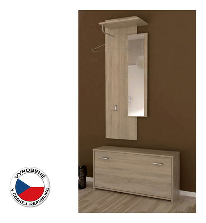 Jednoduchá predsieň v prevedení dub sonoma pozostávajúca z nízkeho botníka a vešiaku s úzkym zrkadlom. Na vešiaku je umiestnená sivá kovová vešiaková tyč umiesnená kolmo na vešiak.