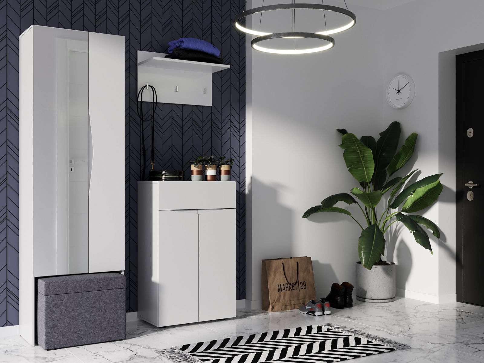 Predsieňová zostava Larco 1 v bielom prevedení je ideálnym riešením pre moderné vstupné priestory. Skladá sa z komody, šatníkovej skrine, vešiakového panelu a taburetky v tmavosivej farbe. Komoda ponúka dostatok úložného priestoru na obuv a doplnky, šatníková skriňa poskytuje priestor na zavesenie kabátov a ukladanie ďalších odevov. Vešiakový panel je vybavený háčikmi na zavesenie kabátov a tašiek, čím šetrí miesto a udržiava poriadok. Taburetka v tmavosivej farbe slúži ako pohodlné sedenie pri obúvaní. Všetky komponenty sú vyrobené z kvalitnej laminovanej drevotriesky a MDF dosky, čo zaručuje dlhú životnosť a jednoduchú údržbu. Biele prevedenie nábytku opticky zväčšuje priestor a ľahko sa kombinuje s rôznymi interiérovými štýlmi. Zostava je dodávaná v demonte s prehľadným montážnym návodom. Ak hľadáte funkčný a esteticky príjemný nábytok do predsiene, táto zostava je skvelou voľbou.