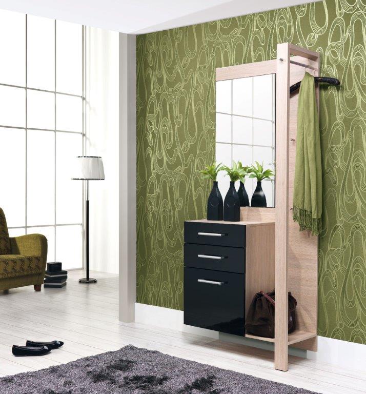 Jednoduchá no moderná predsieň, ktorá sa svojimi rozmermi hodí najmä do menších priestorov. Je vyrobená z laminovanej DTD v nádhernej farbe dreva rijeka svetlá, ktorá je doplnená o čierne zásuvky. Na zadnom panely sú umiestnené vešiaky, veľké zrkadlo, pod ktorým sú tri praktické zásuvky. Hrany sú ukončené ABS úpravou, ktorá zvyšuje odolnosť voči mechanickému poškodeniu, udržuje farebnú stálosť a odolnosť proti vlhkosti.
