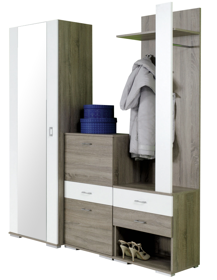 Zostava Puma je skutočná šelma medzi predsieňami. Napriek menším rozmerom Vám ponúka dostatok úložného priestoru. Šatníková skriňa so zrkadlom má vešiakovú tyč na zavesenie oblečenia. V strede sa nachádza botník s výklopnými dvierkami a jednou zásuvkou. Vešiakový panel je umiestnený na botníku so zásuvkami a otvoreným úložným priestorom. Predsieň je vyrobená vo farbe dub sonoma truflová v kombinácii s bielymi prvkami.