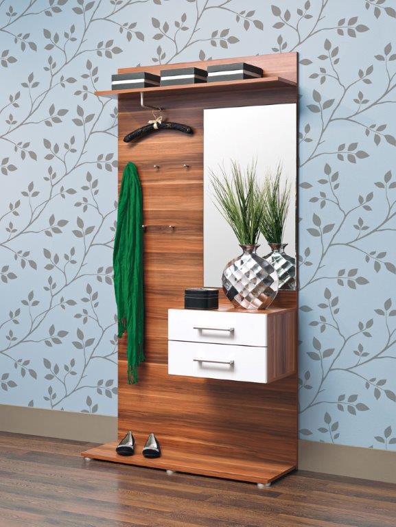 Jednoduchá no moderná predsieň, ktorá sa svojimi rozmermi hodí najmä do menších priestorov. Je vyrobená z laminovanej DTD v nádhernej farbe dreva havana, ktorá je doplnená o biele zásuvky. Na zadnom panely sú umiestnené dve odkladacie poličky, vešiaky na zavesenie oblečenia, zrkadlo, pod ktorým sú dve praktické zásuvky. Hrany sú ukončené ABS úpravou, ktorá zvyšuje odolnosť voči mechanickému poškodeniu, udržuje farebnú stálosť a odolnosť proti vlhkosti.