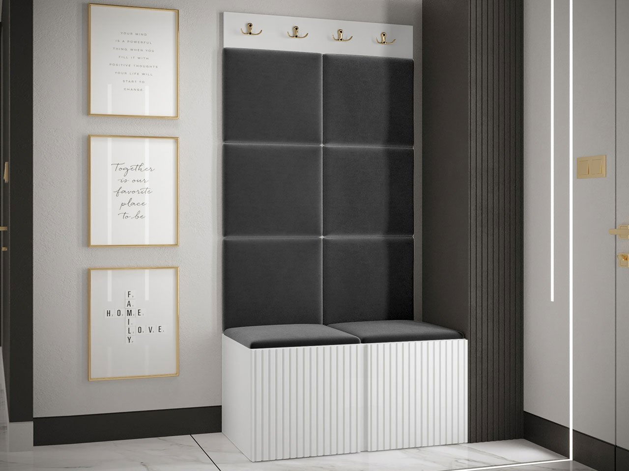 ZobraziťPredsieň Tewarota Slim IV s botníkom, vešiakmi a čalúnenými panelmi je funkčným a elegantným riešením na uloženie oblečenia a obuvi. Miesto na topánky sa nachádza v spodnej časti nábytku a je vybavené dvierkami, za ktorými sa ukrývajú poličky, ktoré poskytujú ďalší základ pre vaše veci. Frézované fronty tohto modelu dodávajú hale nevšedný charakter. Vešiaky v hornej časti predsiene umožňujú pohodlné uloženie vrchného oblečenia, ako sú kabáty alebo bundy. Čalúnené panely plnia dekoratívnu funkciu, ale zároveň chránia steny pred nečistotami a poškodením. Navyše sú aj ideálnym miestom na sedenie, ktoré vám uľahčí obúvanie či prebaľovanie. Takáto predsieň vám umožňuje usporiadať priestor a poskytuje štýlový vzhľad miestnosti.