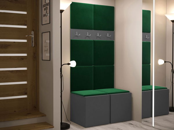 Predsieň Tavasz je kombináciou dekoratívnych prvkov Skrinka na topánky: šírka: 84 cm, výška: 42 cm, hĺbka: 46 cm, Vešiak na šaty 84: šírka: 84 cm, výška: 16 cm, hĺbka: 4,6 cm, Čalúnený panel Pag 42x42: (x8) šírka: 42 cm, výška: 42 cm, hĺbka: 4 cm