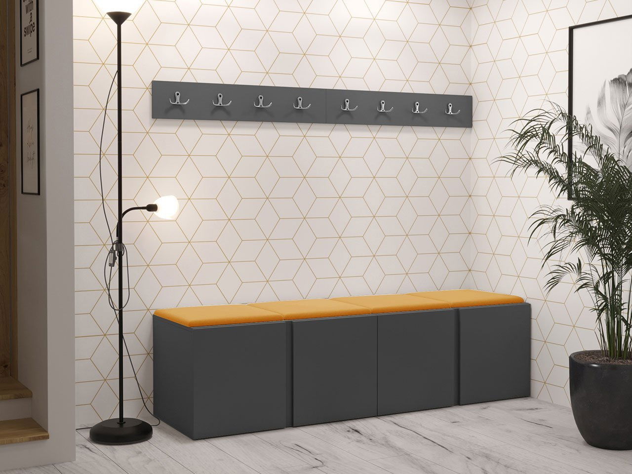 skriňa na topánky x 2: šírka: 84 cm, výška: 42 cm, hĺbka: 46 cm, vešiak na oblečenie 84 x 2: šírka: 84 cm, výška: 16 cm, hĺbka: 4,6 cm, čalúnený panel Pag 42x42 x4: šírka: 42 cm, výška: 42 cm, hĺbka: 4 cm