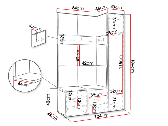 Skriňa na topánky: šírka: 84 cm, výška: 42 cm, hĺbka: 46 cm