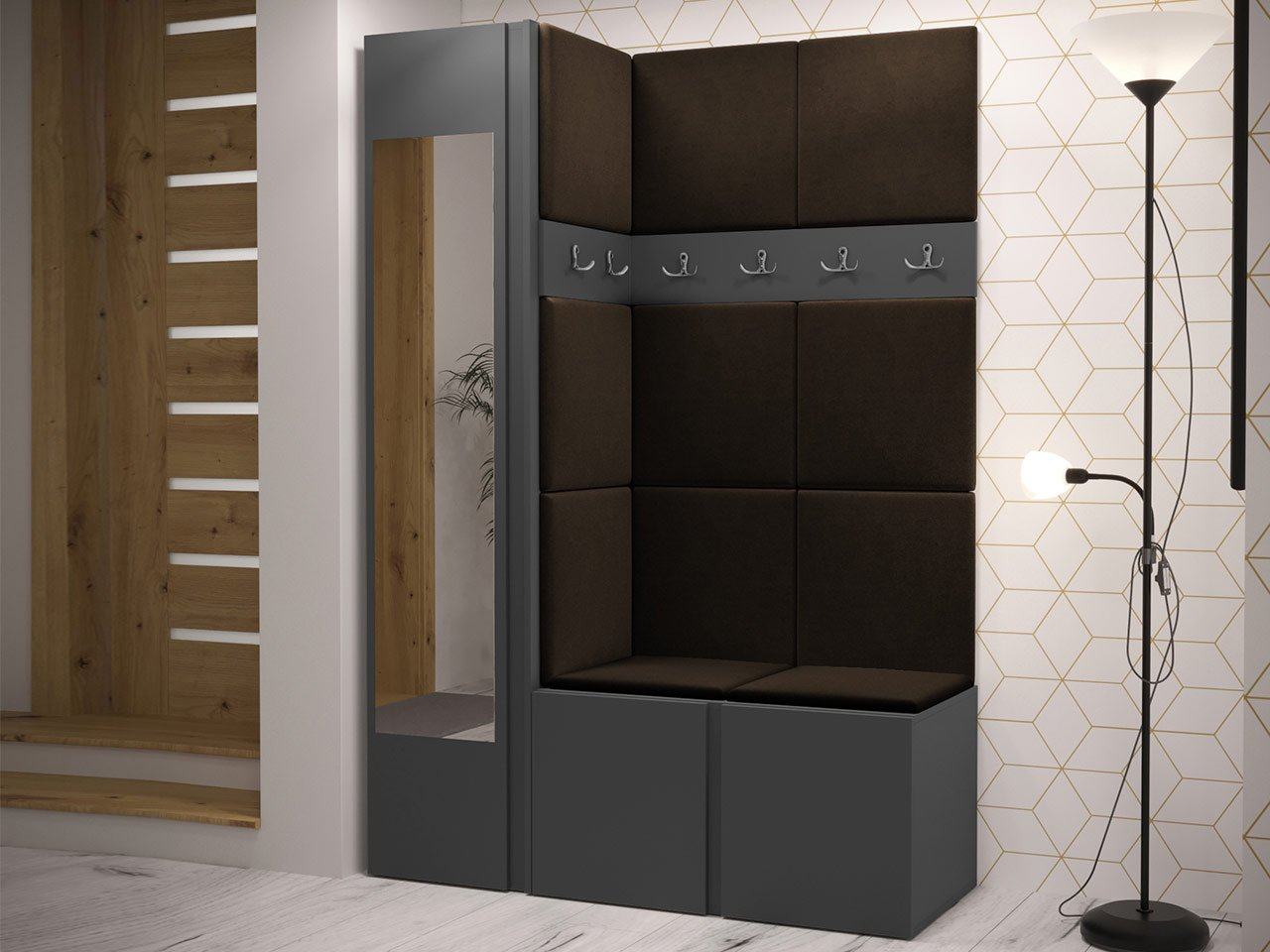 ZobraziťPredsieň je ideálnou voľbou pre tých, ktorí hľadajú pohodlie a štýl. Predsieň Tavasz XXV je skvelým doplnkom modernej predsiene. Sada obsahuje všetky prvky, ktoré potrebujete na usporiadanie vstupnej haly. Priestranný šatník ponúka priestor na vrchné oblečenie. Svoje miesto tu nájdu aj šály, čiapky a rukavice. Skrinka na topánky okrem uloženia obuvi umožňuje aj pohodlné obúvanie a vyzúvanie po návrate domov. Na praktické vešiaky môžete zavesiť svoje často používané bundy, klobúk alebo kľúče. Celok dopĺňajú módne a štýlové čalúnené panely, ktoré dodajú interiéru útulnosť a moderný charakter. Široká škála farieb vám umožní zladiť šatník s predsieňou z hľadiska bytového dekoru, ale aj osobných preferencií. Rozmery: Skriňa so zrkadlom 40: šírka: 40 cm, výška: 186 cm, hĺbka: 44 cm, Skrinka na topánky: šírka: 42 cm, výška: 42 cm, hĺbka: 44 cm, Vešiak na šaty 42: x 2 šírka: 42 cm, výška: 16 cm, hĺbka: 4,6 cm, Čalúnený panel Pag 42x42: x 7 šírka: 42 cm, výška: 42 cm, hĺbka: 4 cm Prevedenie : 16 mm hrubá laminovaná doska, okraje sú zakončené odolnou 0,5 mm PVC dyhou, ktorá je odolná voči každodennému používaniu, žiadne rukoväte, plastové nohy, obyčajné pánty, vešiaky obsahujú 4 dvojité háčiky Prevedenie čalúneného panelu: materiál: základom panelu je doska s hrúbkou 8 mm + 3 cm hrubá pena T18 + látka, tvar: štvorcový, 3D efekt, chráni steny pred poškodením, zvukotesný, aplikácia: interiér Záruka : 24 mesiacov