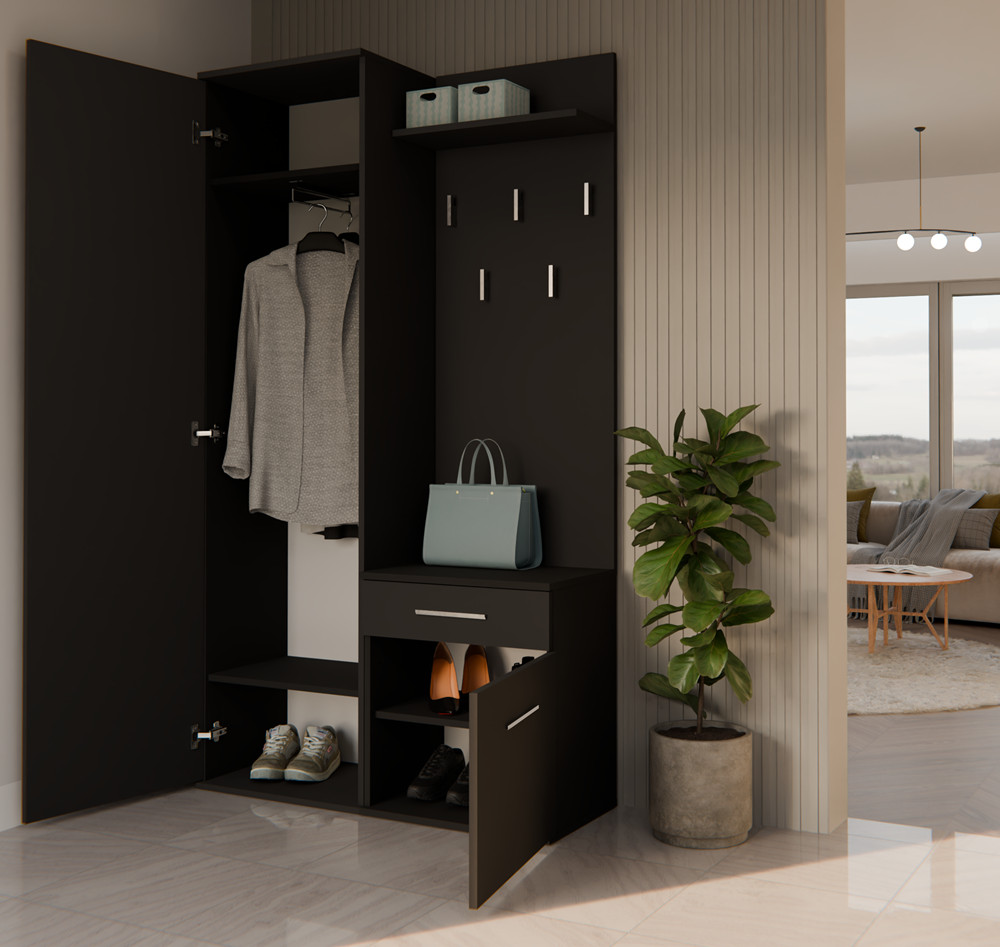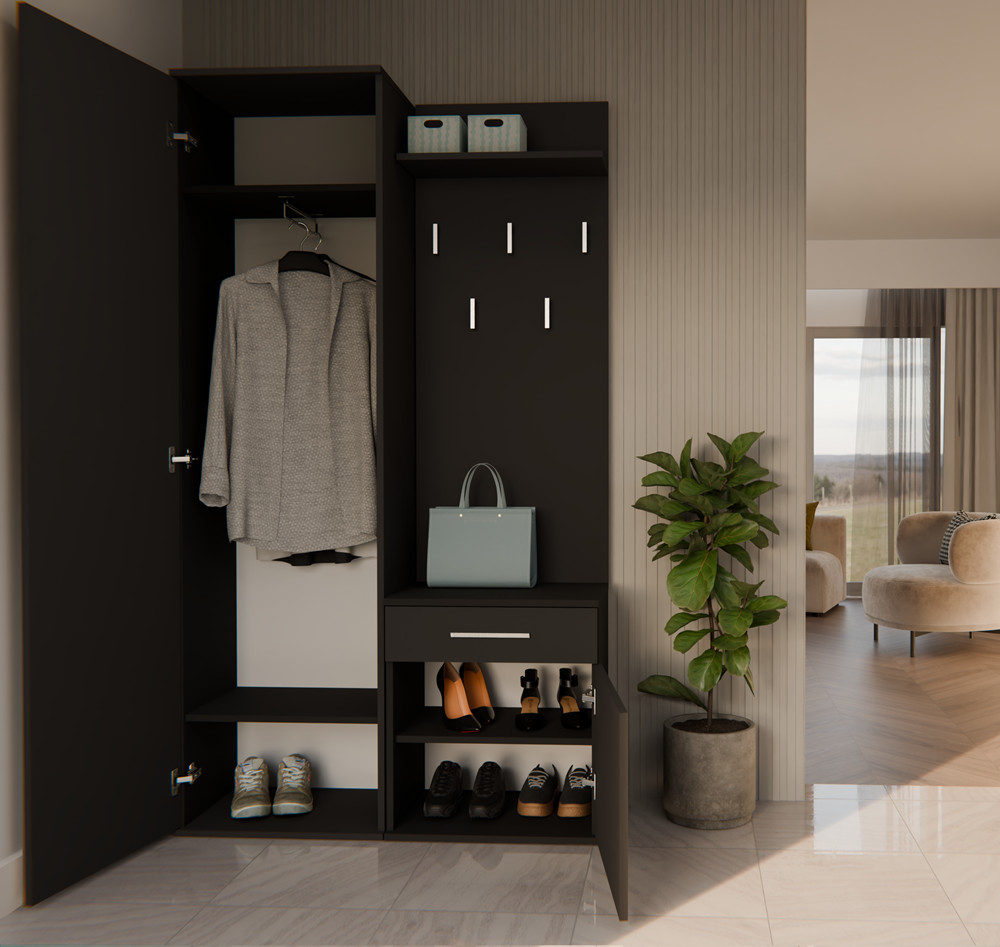Predsieňová zostava Dialogos 1 je ideálnym riešením pre tých, ktorí hľadajú kombináciu moderného dizajnu a praktickosti. S elegantným matným čiernym povrchom, táto zostava obsahuje veľkú šatníkovú skriňu s zrkadlom, praktickú zásuvku a menšiu skriňu, ktorá ponúka dostatok úložného priestoru. Vďaka možnosti montáže na ľavú alebo pravú stranu a variabilnému usporiadaniu jednotlivých kusov nábytku, si môžete prispôsobiť predsieň podľa svojich potrieb. Tento nábytok je vyrobený z kvalitných materiálov, čo zaručuje jeho dlhú životnosť a jednoduchú údržbu.
