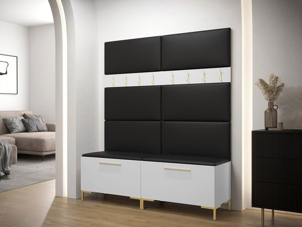Skriňa na topánky Frunofta x2: šírka: 84 cm, výška: 52 cm, hĺbka: 46 cm, Vešiak na šaty 84 Frunofta x2 : šírka: 84 cm, výška: 16 cm, Čalúnený panel Pag 84x42: x8 šírka: 84 cm, výška: 42 cm, hĺbka: 4 cm