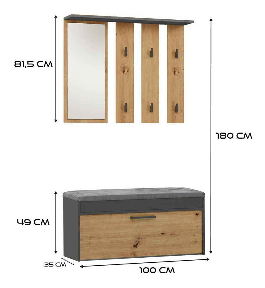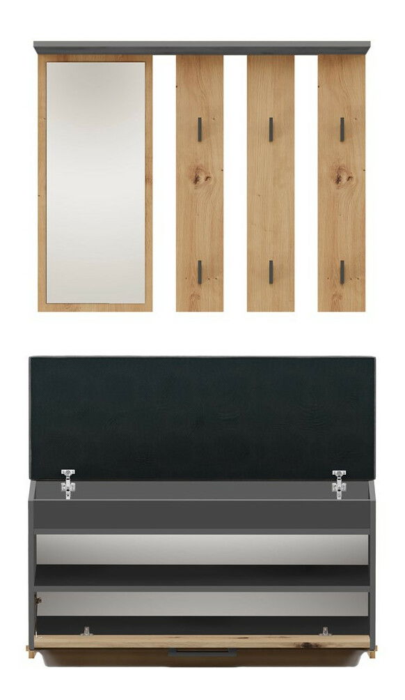 Predsieňová zostava Puntuable 1 v elegantnej kombinácii antracit a dub artisan je ideálnym riešením pre moderné interiéry. Tento praktický nábytok obsahuje šesť štýlových čiernych vešiakov na oblečenie, zrkadlo a špeciálnu skriňu na obuv so sedením a úložným priestorom, čo zaručuje maximálny komfort a funkčnosť. Vyrobený z kvalitnej laminovanej drevotriesky, táto zostava spája jednoduchosť a eleganciu, čím sa stáva skvelým doplnkom do každej predsiene. Vytvorte si útulný a organizovaný priestor s touto nadčasovou zostavou.