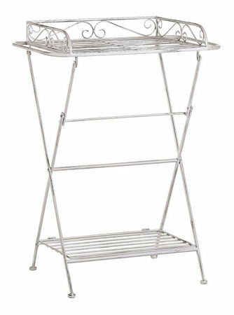 Tento odkladací stolík je skvelým príkladom dokonalej rovnováhy medzi vintage dizajnom a glamour štýlom. Je vyrobený z odolného kovu v bielom prevedení a vďaka svojej ľahkej konštrukcii sa s ním ľahko manipuluje. Nádherné kovové spracovanie s praktickou policou ponúka úložný priestor na knihy, časopisy a iné drobnosti. Stolík sa dá zložiť a jednoducho uskladniť.