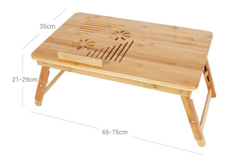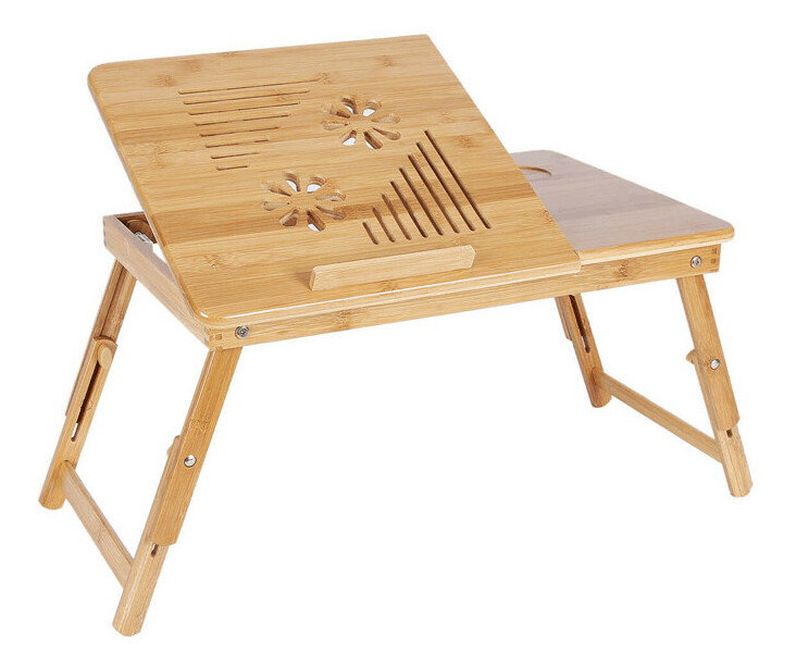 Odkladací stolík na notebook z bambusu ponúka praktické a estetické riešenie pre prácu aj oddych. Doska je rozdelená na dve časti, z ktorých jedna je nastaviteľná do rôznych uhlov a vybavená vetracími otvormi pre lepšie chladenie zariadenia, doplnená o zarážku proti skĺznutiu. Druhá časť slúži ako pevná plocha s výrezom na umiestnenie šálky alebo drobných predmetov. Pevné skladacie nohy umožňujú jednoduché prenášanie a skladovanie, pričom bambusové prevedenie zabezpečuje stabilitu a prírodný vzhľad. Stolík je ideálny na použitie v posteli, na pohovke alebo na podlahe, pričom jeho rozmery a nosnosť zodpovedajú bežným potrebám domáceho aj kancelárskeho využitia.