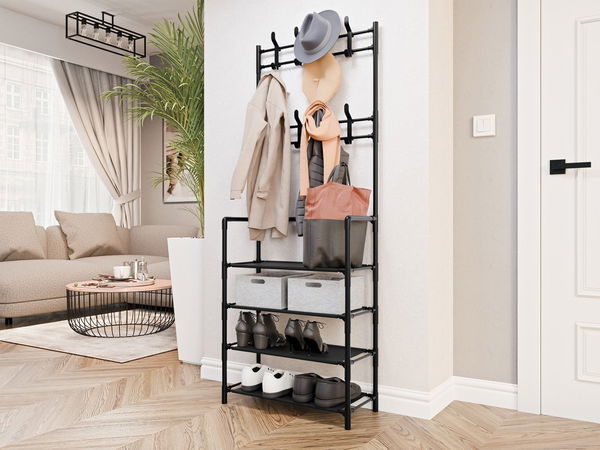 Regál je ideálnou voľbou pre tých, ktorí hľadajú pohodlie a štýl. Otvorená polica Atenas je všestranný a moderný kus nábytku, ktorý skvele poslúži v chodbe, šatni alebo aj v kancelárii. Kovová konštrukcia v elegantnej čiernej farbe poskytuje štýlový vzhľad, ktorý sa hodí do rôznych interiérových prevedení – od moderného až po industriálny. Moderný regál Atenas je vybavený množstvom prvkov, ktoré uľahčujú organizáciu priestoru. Vrchná časť obsahuje háčiky ideálne na zavesenie búnd, kabátov, šálov alebo kabeliek. Spodné police poskytujú dostatok priestoru na uloženie obuvi, škatúľ alebo iných nevyhnutných predmetov. Vďaka jednoduchému tvaru a kompaktným rozmerom je otvorená polica Atenas ideálna do veľkých aj menších miestností, pričom optimálne využíva dostupný priestor. Rozmery: šírka: 60 cm, výška: 155 cm, hĺbka: 26 cm prevedenie: rám: 15 mm hrubý čierny kovový rám + plastové konektory, police: obsahuje 4 látkové, obsahuje 8 háčikov, jednoduchá a rýchla inštalácia Záruka: 24 mesiacov