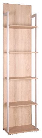 Vysoký regál so štyrmi otvorenými poličkami umiestnenými nad sebou, ktoré sú po oboch stranách spevnené hranatou tyčou sivej farby. Táto hranatá tyč je na spodku upevnená na bok poličky a tiahne sa po oboch stranách až nad hornú poličku pri ktorej sa upevňuje do zadnej steny regálu.