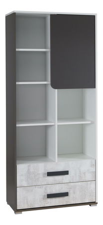 Kam poodkladať všetky knihy, dekorácie a doplnky? Regál s otvorenými poličkami a dvomi zásuvkami v spodnej časti sú správnym riešením. V pravej hornej časti sa dve poličky ukrývajú za dvierkami s oblým výrezom v rohu. Zásuvky majú podlhovaste plastové úchyty. Regál stojí na plastových nožičkách.
