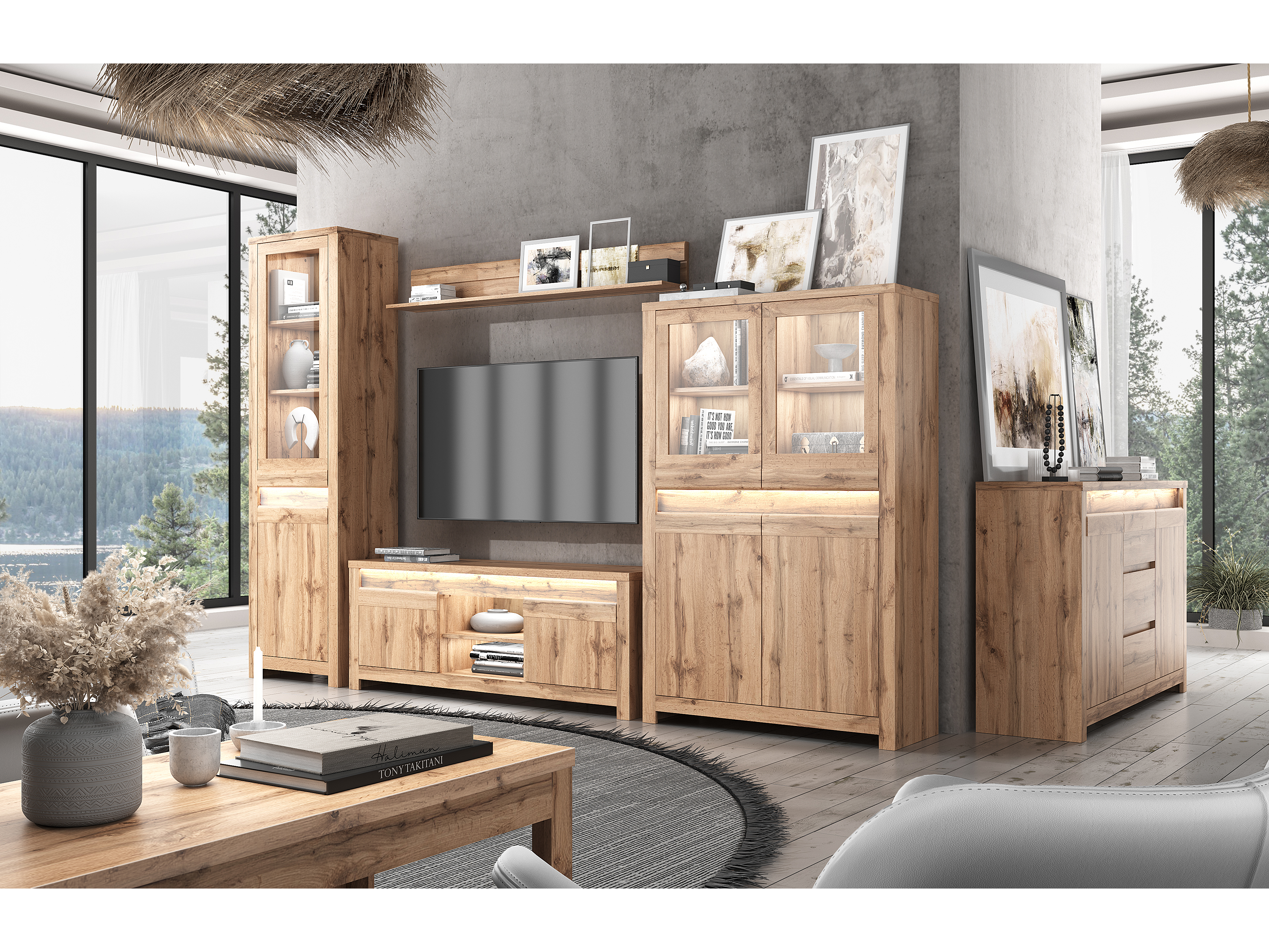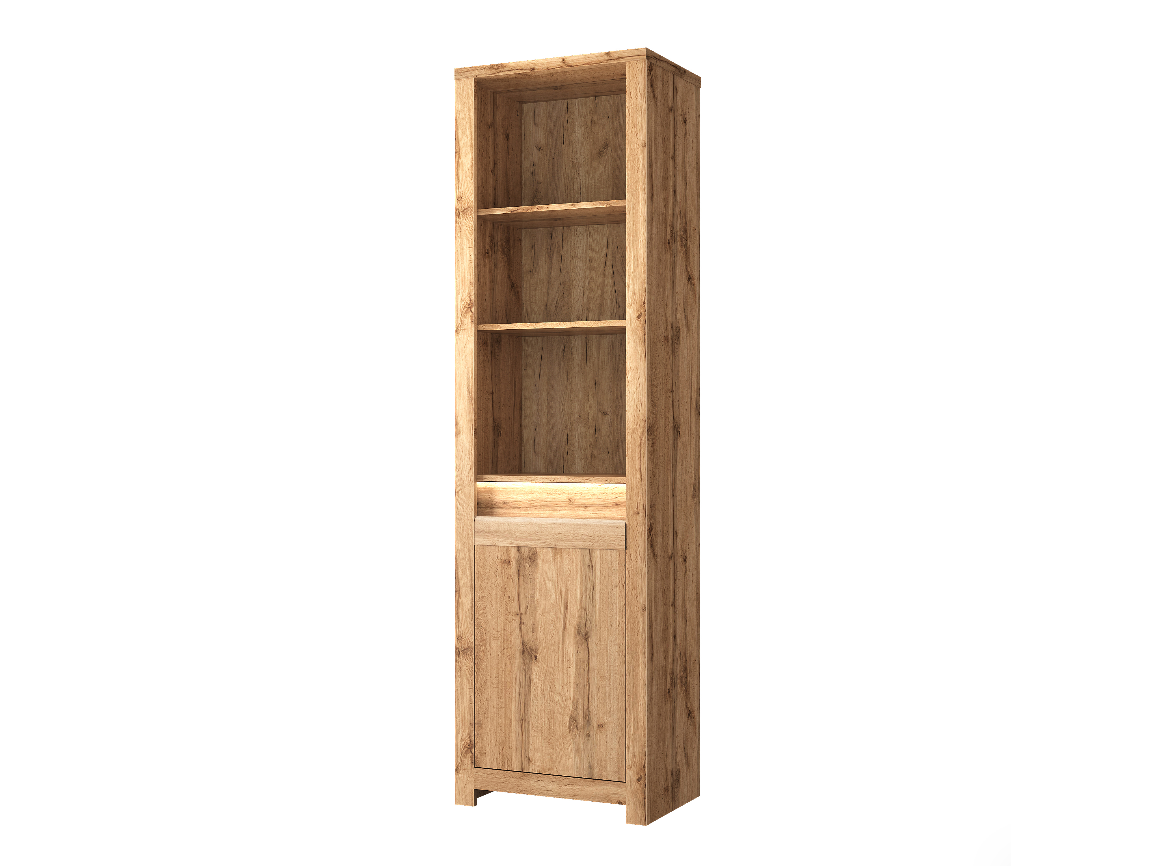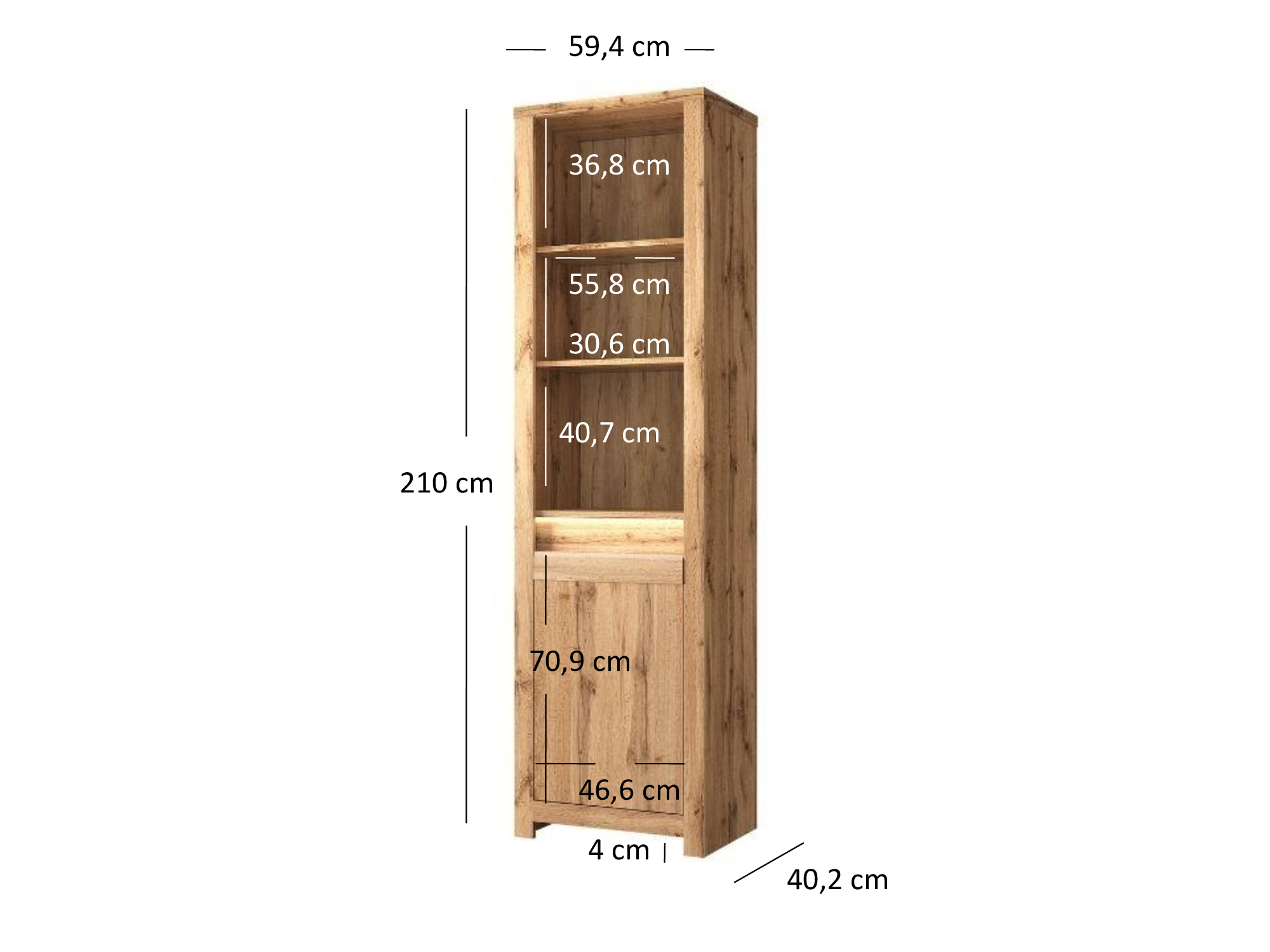 Regál Chase (dub wotan) s výškou 210 cm a hĺbkou 40 cm poskytuje dostatok úložného priestoru pre vaše veci. Materiál prednej strany je laminovaná doska a MDF, kým materiál korpusu je laminovaná doska s ABS hranami a materiál dosky je laminovaná doska. Regál neobsahuje úchytky, no má široké bočné pásy a MDF pásik na prednej strane. Poličky sú tiež vyrobené z laminovanej dosky. Regál nezahŕňa osvetlenie a jeho montáž si musíte zabezpečiť sami. Rozmery balíka č.1 sú 171,5 x 46 x 12,5 cm s váhou 16,3 kg a rozmery balíka č.2 sú 212 x 62,5 x 6,5 cm s váhou 26 kg. Regál Chase (dub wotan) je praktický nábytok s dostatočným úložným priestorom a moderným dizajnom vhodný pre každú domácnosť.
