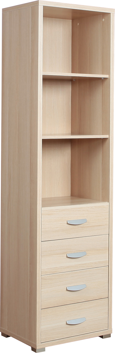 Úzky regál, ktorý má v hornej polovici otvorené poličky a v dolnej štyri zásuvky.