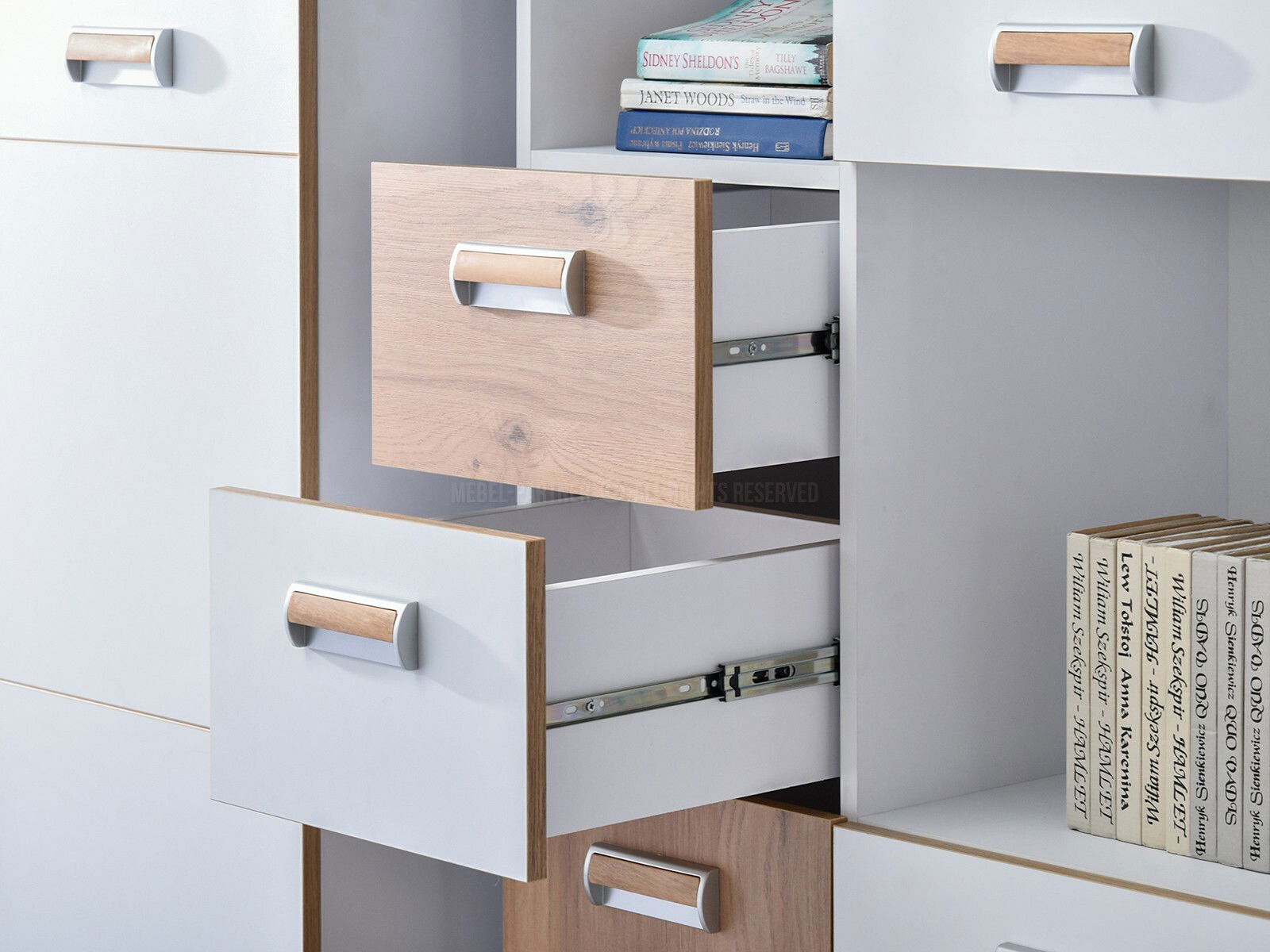 s uzavretými policami, s otvorenými policami, so zásuvkami, výsuvy s guľôčkovými ložiskami