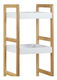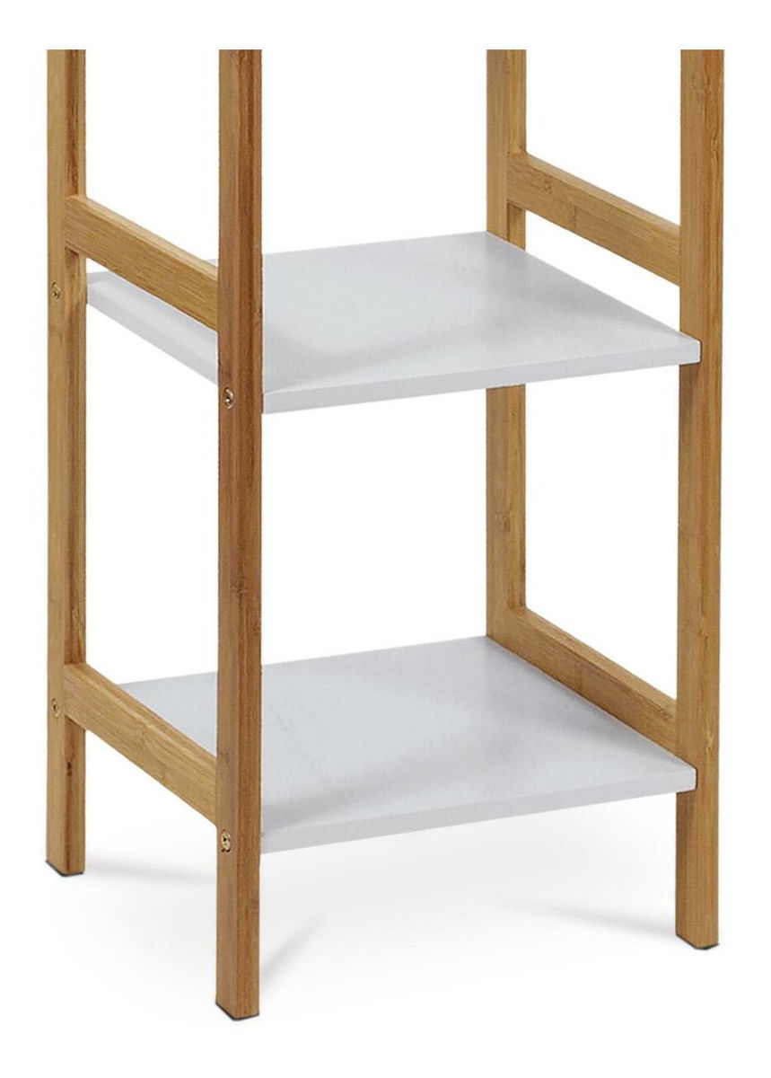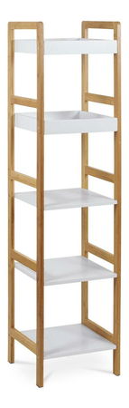 Multifunkčný päťpolicový regál v Škandinávskom štýle. Nosná konštrukcia je vyrobená z masívneho bambusu, lakovaného kvalitným transparentným lakom. Bambus ako taký opudzuje vodu a touto povrchovou úpravou dosahuje veľmi dobrú vodeodolnosť. Police sú vyrobené z MDF dosiek a lakované kvalitným polyuretánovým bielym matným lakom. Čím aj u nich je zaručená vodeodolnosť. Týmto spracovaním je regál vhodný do kúpeľní, ale ideálny bude aj v ostatných miestach domácnosti. Horné dve police majú boky zo všetkých strán, ostatné tri sú klasické rovné. Ich nosnosť je až 3 kg, celková 15 kg. Či už regál využijete na uloženie kozmetiky, uterákov a osušiek alebo ako stojan na kvety či dekorácie, vždy s ním budete spokojní. Záleží len na vašich nápadoch.