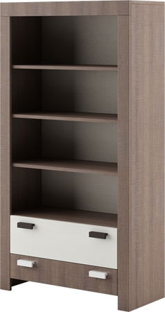 Vysoký regál so štyrmi veľkými poličkami a dvoma zásuvkami, jednou hlbšou a druhou plytšou.