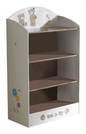 Aj deti potrebujú mať svoj nábytok zladený a ideálne do štýlu peknej rozprávky s medvedíkom. Regál na hračky deti poožívajú od skorého rána až do večera, keďže v ňom stále niečo hľadajú a doňho umiestňujú. Regál na hračky s motívom macka je v bielej farbe a má 4 poličky v odtieni čokoládovej. Zadná stena je hore zaoblená.