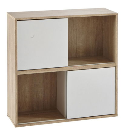 Viacúčelový regál s priečinkami a zasúvacími dvierkami v prevedení dub v kombinácii s bielou. Veľmi vhodný do moderných obývačiek, pracovní alebo študentských izieb.