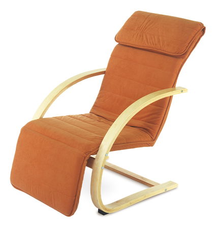 Relaxačné kreslo v látkovom čalúnení v prevedení farba terracotta. Drevená konštrukcia umožňuje jemné pohupovanie, prevedenie dreva je prírodná farba. Podnožka je nastaviteľná.