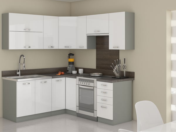 Rohová kuchyňa Brunea v modernom prevedení sivá s lesklými bielymi dvierkami je praktickým a štýlovým riešením pre váš domov. Vďaka rozmerom 170 + 130 cm maximálne využíva priestor a ponúka dostatok úložného priestoru v skrinkách a zásuvkách. Povrch kuchyne je ľahko udržiavateľný a odolný voči poškriabaniu, čo z nej robí ideálny nábytok do kuchyne, ktorý vydrží každodenné používanie.