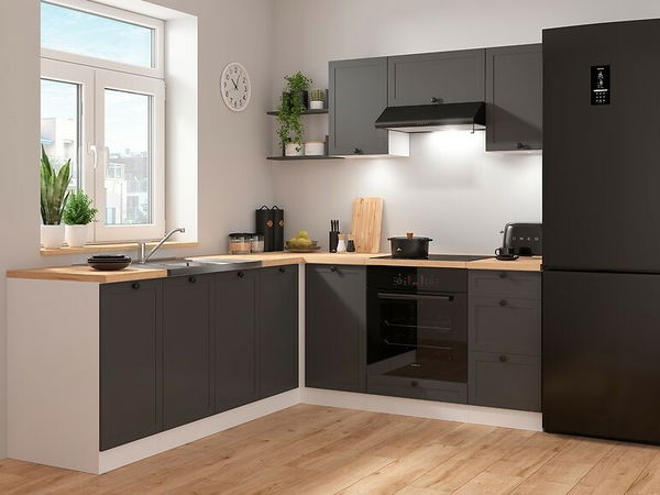 Rohová kuchyňa Junona Line je perfektným riešením pre ľudí, ktorí si cenia flexibilitu pri usporiadaní priestoru. Vďaka svojej všestrannosti môžete konštrukciu jednoducho prispôsobiť ľavému alebo pravému rohu v závislosti od vašich individuálnych potrieb a dispozičného riešenia miestnosti. Takáto kuchyňa nielen optimalizuje využitie dostupného priestoru, ale vytvára aj útulné a funkčné miesto na varenie a trávenie času s blízkymi. Kuchynská linka Junona Line je dokonale organizovaný priestor. Spodná časť ponúka všetko potrebné: praktické skrinky s dvierkami, priestrannú skrinku pod drez, miesto na rúru a funkčnú sadu troch zásuviek na kuchynské doplnky. Horné závesné skrinky vám poskytnú ďalší priestor na uloženie riadu a potravín. Elegantné, jednoduché úchytky zdôrazňujú minimalistický charakter nábytku. S radom Junona si vytvoríte kuchyňu, ktorá bude nielen krásna, ale predovšetkým praktická pri každodennom používaní.