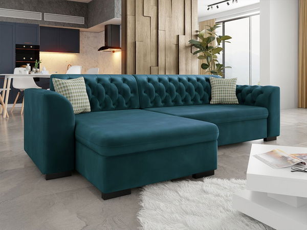 Rohová rozkladacia pohovka Leon je elegantná ponuka! Charakter podčiarkuje hlboké prešívanie, ktoré bolo použité na chrbtovej opierke a vnútornej časti podrúčiek. Dekoratívny akcent navyše dokonale ladí s použitou látkou. Navyše sada obsahuje dva malé vankúšiky so zipsom. Na druhú stranu použité komponenty zodpovedajú za komfort používania. Vďaka silnej vrstve peny je sedák extrémne mäkký a pohodlný. Rohová sedacia súprava ponúka funkciu spania. V rozloženom stave má povrch 225 cm x 125 cm, čo zaisťuje pohodlný spánok pre dve osoby. Náhradné lôžkoviny si však môžete nechať v úložnom priestore, ktorý je umiestnený pod sedadlom.