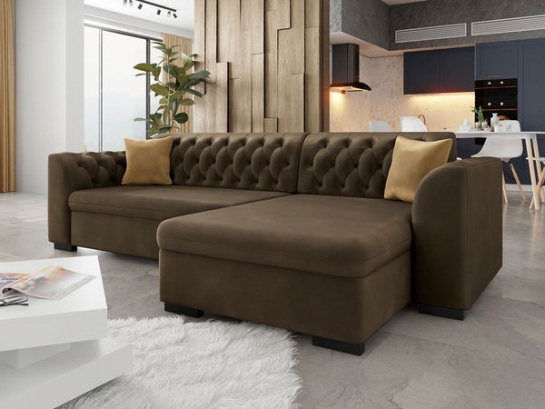 Rohová rozkladacia pohovka Leon je elegantná ponuka! Charakter podčiarkuje hlboké prešívanie, ktoré bolo použité na chrbtovej opierke a vnútornej časti podrúčiek. Dekoratívny akcent navyše dokonale ladí s použitou látkou. Navyše sada obsahuje dva malé vankúšiky so zipsom. Na druhú stranu použité komponenty zodpovedajú za komfort používania. Vďaka silnej vrstve peny je sedák extrémne mäkký a pohodlný. Rohová sedacia súprava ponúka funkciu spania. V rozloženom stave má povrch 225 cm x 125 cm, čo zaisťuje pohodlný spánok pre dve osoby. Náhradné lôžkoviny si však môžete nechať v úložnom priestore, ktorý je umiestnený pod sedadlom.
