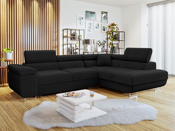obdĺžnikovému konferenčnému stolíku. Toto harmonické duo je ideálne do hosťovskej izby. Poskytuje veľa priestoru na sedenie a vytvára ideálne podmienky pre stretnutie s priateľmi. Premyslený dizajn a doplnky sú zodpovedné za zvýšenú kvalitu odpočinku. Polohovateľné opierky hlavy patria budú obľúbené u celej rodiny. Dajú sa prispôsobiť tvaru tela dieťaťa, ale aj dospelého. Výhodou nábytku je aj rozkladacia funkcia. V rozloženom stave poskytuje komfortné podmienky pre každodenný spánok. Priestranný úložný priestor na posteľnú bielizeň rieši starosti s ukladaním vankúšov a perín. Pomôže vám s udržiavaním poriadku v obývačke a poskytuje aj ďalší priestor pre sezónne oblečenie a iné zriedkavo používané veci.