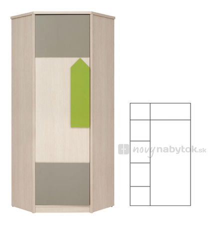 Rohová, moderná a priestranná šatníkovo-policová skriňa SZF2D_20_8 série Strzalka je veľmi vhodná do detskej izby. Vďaka svojim rozmerom Vám poskytne dostatok úložného priestoru pre Vaše bundy alebo kabáty. Zaujímavé farebné prevedenie dubového dreva a šedej farby v kombinácií so zelenými doplnkami korešpondujú s prevedením celej série. Skriňa je vyrobená z kvalitných materiálov.