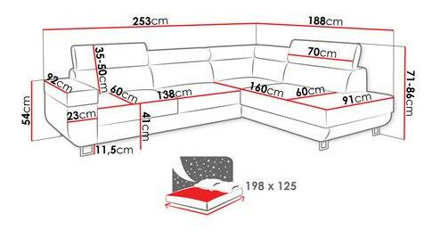 Rohová pohovka s funkciou spania je ideálnou voľbou pre tých, ktorí hľadajú pohodlie a štýl. Spôsobom, ako osviežiť interiér, je štýlový a praktický nábytok z vhodne zvolených látok. Naším návrhom je rohová pohovka Antrodem s funkciou spania. Je nielen funkčný, ale aj mimoriadne dekoratívny. Materiál, ktorým je čalúnená, má charakteristické pruhy, ktoré dodávajú osobitý charakter každému usporiadaniu. Okrem vizuálnej vrstvy obsahuje aj množstvo riešení na uľahčenie každodenného života. Rohová pohovka je rozkladacia. Je vybavená kontajnerom na lôžkoviny, nastaviteľnými opierkami hlavy a plochou na spanie s rozmermi 198 x 125 cm. Je to voľne stojaci typ na vysokých nohách. Dokonale sa osvedčí v mnohých dizajnových projektoch, moderných aj klasických. Svojím vzhľadom obohatí každý priestor. Rozmery: dĺžka: 253 cm, šírka: 188 cm, výška: 71-86 cm, plocha na spanie: 198 x 125 cm, rozmery kontajnera: dĺžka: 170 cm, šírka: 82 cm, výška: 15 cm Rohová strana: ľavá alebo pravá Prevedenie: konštrukcia sedadla: drevený rám + vlnitá pružina + plsť + vlnovec + T 2844 s hrúbkou 9 cm, konštrukcia chrbta: drevený rám + drevovláknitá doska + vlnovec + T 2844 pena, hrúbka 5 cm, rohová pohovka je rozkladacia, má funkciu spánku, nádoba na podstielku, nastaviteľné opierky hlavy, 13 cm vysoké nohy, predná časť z chrómovaného kovu, zadná časť je vyrobená z plastu, čalúnené operadlo napevno, voľne stojaca rohová pohovka (zadná časť čalúnená látkou) Záruka: 24 mesiacov