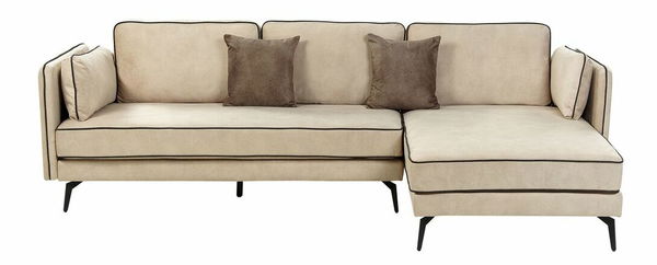 Pohodlie a dokonalý vzhľad – to je niečo, čím táto rohová pohovka vyniká. Je čalúnená kvalitným a odolným zamatovým polyesterom v klasickej béžovej farbe, s ktorým krásne kontrastuje čierne lemovanie na sedacej časti, opierkach rúk a operadle. Hrubý sedací vankúš robí z tohto modelu skvelé miesto na odpočinok, zatiaľ čo kovové nohy zabezpečujú stabilitu celej konštrukcie. Vďaka svojmu dizajnu sa pohovka hodí do interiérov v rôznych štýloch, ale najlepšie vynikne v tých moderných.